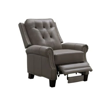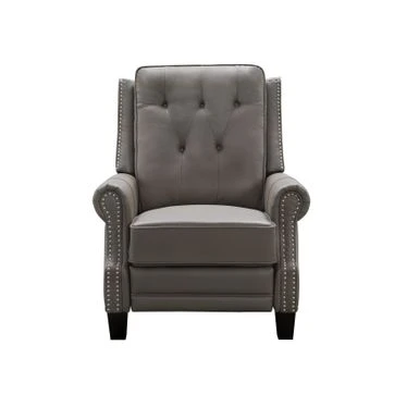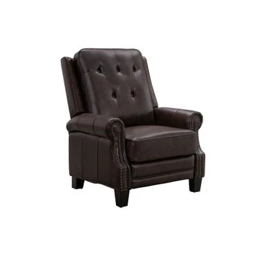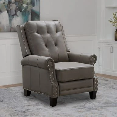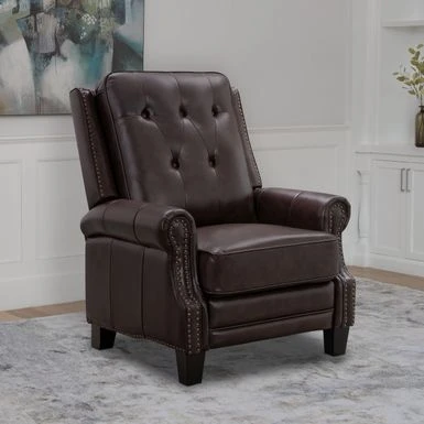 This top grain leather recliner features push-back reclining functionality for ultimate comfort. The studded nail head detailing elevates the style, while cushioning maximizes comfort. You get all in one with this beautiful and luxurious piece, perfect for any living space, den, or office.