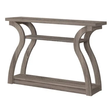 - Entry table with a unique curved design in dark taupe with a wood look finish on all sides