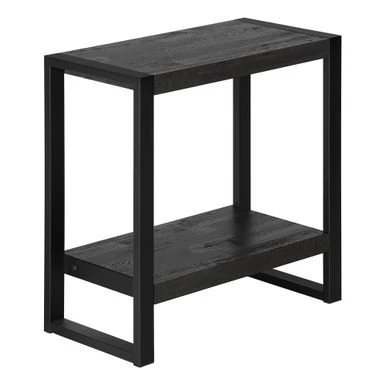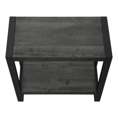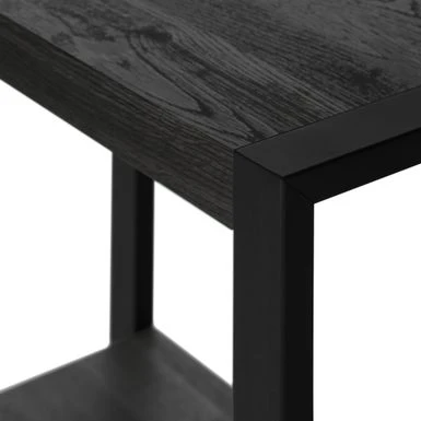Industrial-farmhouse style combines modern metal with a rustic wood finish to create a warm, inviting look. This two-tier rectangular accent table embodies that popular style. The tabletop and bottom shelf are finished in a black reclaimed-wood look with naturalistic color variations and a subtle wood-grain texture. Robust metal legs in a black finish provide stability and a striking visual contrast. Finished on all sides, this side table can be positioned in any direction to fit both narrow and wide spaces in a living room or bedroom.