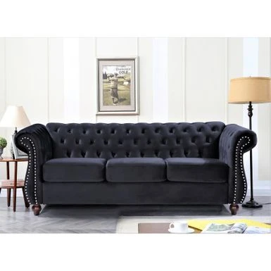 Experience timeless elegance and luxury with the Antoinette Chesterfield 2-Piece Set, featuring a sofa and loveseat. Made with a sturdy wood frame and finely tailored with tight pleated rolled arms, this set boasts a clean-lined silhouette that is accentuated by wood round tapered feet. The crushed velvet upholstery adds a touch of glamour to the design, while the high-density foam fill with spring support, piped seat cushions, matching bolster pillows, and button-tufted backrest offer exceptional comfort and style. Coordinating throw pillows complete the look, making this set an ideal addition to any sophisticated living space.