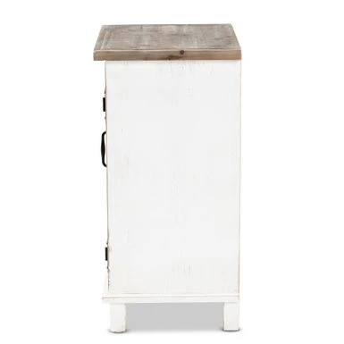 Bedroom organization is made easy with the charming Faron nightstand. Made in China, the Faron is comprised of a sturdy wood frame featuring a lightly weathered two-tone white and oak brown finish for an aged, vintage look. Bedroom organization is made easy with the charming Faron nightstand. Made in China, the Faron is comprised of a sturdy wood frame featuring a lightly weathered two-tone white and oak brown finish for an aged, vintage look. Two shelves behind the door provide ample space to organize bedside essentials, while the tabletop lends space for daily use. Fully assembled, the Faron is adorned with antique inspired, black finished metal accents for a cool, industrial touch. A fantastic assistant to the modern household, the Faron nightstand adds value to any space.. Ideal for smaller dining rooms and nooks, the Sanford dining nook set rejuvenates any space. Constructed from firwood and metal Style: traditional Materials: firwood, metal Color: white, oak brown Two-tone distressed white and white-washed oak brown finish Two (2) shelves behind the door Inset paneling Antique inspired, black finished metal accents Includes: one (1) nightstand Assembly: assembled Care instruction: wipe clean Dimensions: 28″ high x 18.9″ wide x 13.8″ deep Upper shelf: 10.6″ high x 16.1″ wide x 11.4″ deep Lower shelf: 9.8″ high x 16.1″ wide x 11.4″ deep Product weight: 20.7 lbs.