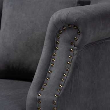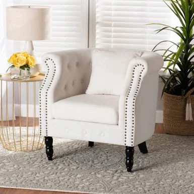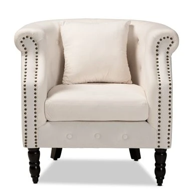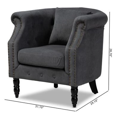 Rest and unwind with the sumptuous comfort of the Renessa armchair. Made in China, this chair is comprised of a sturdy wood frame padded with layers of plush foam and upholstered in rich velvet fabric. Rest and unwind with the sumptuous comfort of the Renessa armchair. Made in China, this chair is comprised of a sturdy wood frame padded with layers of plush foam and upholstered in rich velvet fabric. Button tufted accents produce an air of elegance while a nail head trim outlines the curled arms of the chair with contemporary glamour. Ring-turned legs add a touch of grace, making the Renessa armchair a sophisticated addition to any space…. Curled arms Style: Classic Materials: fabric “polyester 100%”, plywood, foam Color: Beige, Dark Brown Constructed from Plywood Frame Padded with foam and upholstered in polyester fabric Ring-turned legs Button-tufted Includes: one (1) chair Assembly: Assembly Required Care instruction: spot clean Overall dimensions: 28.70″ high x 31.10″ wide x 29.10″ deep Seating area dimensions: 19.10″ wide x 22.00″ deep x 17.70″high Arm: 29.10″ high Legs: 3.30″ high Back:13.00″ high Product weight: 31.7 lbs.