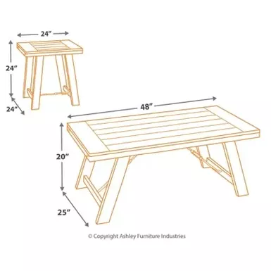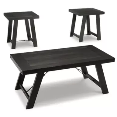 Introduce a handsome country feel in your living area with the casual Noorbrook occasional table set. Planked tops with a breadboard layup supported on canted legs give this set a distinctive farmhouse look. The vintage distressed black wash finish combined with the end tables’ leg stretchers and coffee table’s tension bars deliver a sense of industrial antiquity that makes this set look robust─what a sharp look that transcends time.
