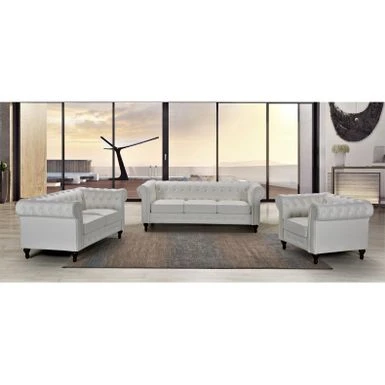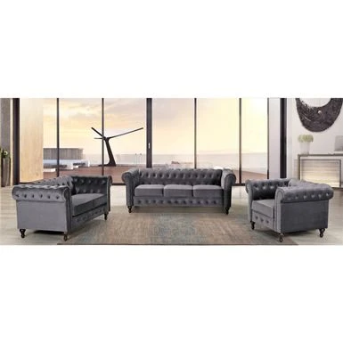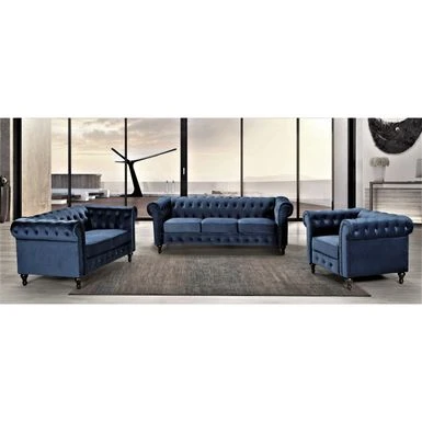 Invite timeless style and luxurious comfort into your home with the Brooks Classic Chesterfield 3-Piece Living Room Set. Crafted consciously with high-quality materials, this set includes a stunning sofa with two accent pillows, a loveseat, and a chair. The two-tone matte velvet upholstery exudes elegance while the high-density foam ensures cozy seating. Loose back cushions showcase intricate details, making this set a chic addition to any living space.
