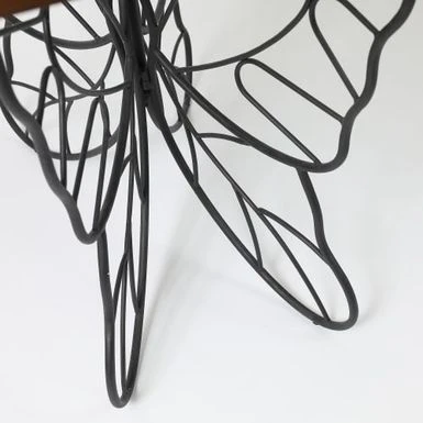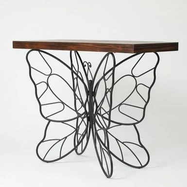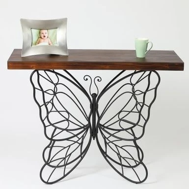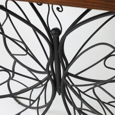 Add a touch of whimsy to your home with this Butterfly Black and Brown Metal and Wood Accent Table. The stunning black metal butterfly stand is paired with a dark-maple finish top, making it a stylish and unique piece for any entryway or living area. Display your favorite decor on the natural fir wood tabletop and enjoy the charm of this welcoming statement piece. This butterfly table is perfect for butterfly lovers and will make your house feel like home.