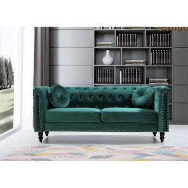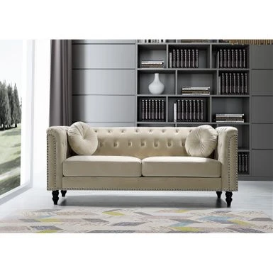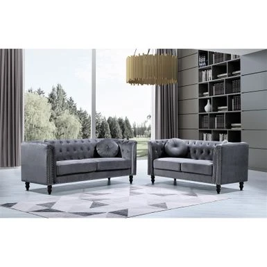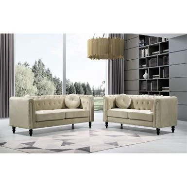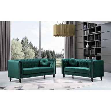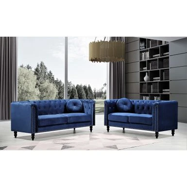 Elevate your home decor with the timeless appeal of the Calvin Classic Velvet Kittleson Nailhead Chesterfield 2-Piece Set. With its clean-lined silhouette, tight arms, and wood round tapered feet, this sofa and loveseat set exudes sophistication. The crushed velvet fabric upholstery adds glamour, while high-density foam fill with spring support and a button-tufted backrest ensure comfort. The set includes matching bolster pillows and coordinating throw pillows, making it the perfect addition to any living room.