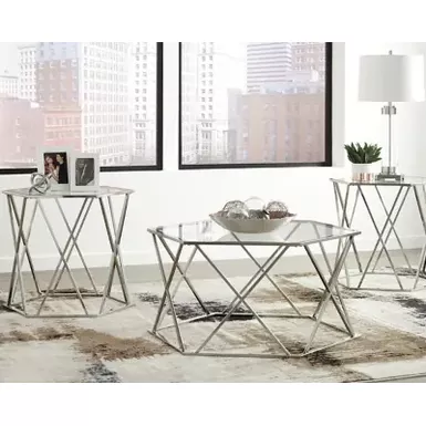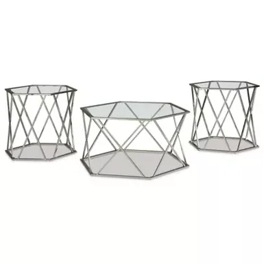 With its sculptural, hexagonal design, the Madanere coffee table set lets modern minimalism beautifully take shape. Chrome-tone metal merged with clear glass is sheer brilliance.