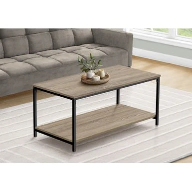 - Bring flair to your living room with this cocktail table, featuring a two tier dark taupe laminate finish and a striking metal leg base