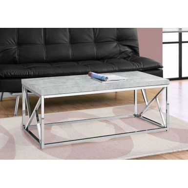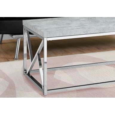 With an industrial inspired chic grey cement look table top and a stylish thick paneled design, this beautiful cocktail table gives an exceptional look to any room. The modern rectangular shape and criss-cross chrome metal design provides sturdy support as well as a contemporary look. Use this multi-functional coffee table to compliment your living space.