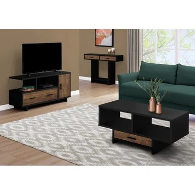 - Contemporary two-tone coffee table in a smooth black and brown reclaimed wood-look finish on all sides