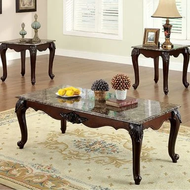 Create a cozy and welcoming ambiance in your living space with this stunning Colchester Traditional 3 Piece Coffee Table Set. The set features a captivating dark cherry finish that exudes warmth and classic traditional style. Made from solid wood, wood veneer, and composites, this coffee table set boasts cabriole legs and traditional carvings. The elegant faux marble tops add a touch of luxury to the overall design, making it perfect for any upscale living area.