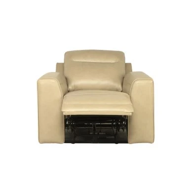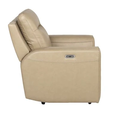 Relax into the supple softness of this top grain leather living room chair, with power reclining headrest and footrest. The sand leather upholstery is accented by decorative stitching details and will easily blend with any modern to transitional style dcor. The control panel located on the right side offers a convenient home button to return the chair to its original position and a USB charging port to keep your devices charged.