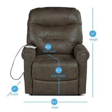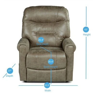 - Recliner Dimensions: 43 inches high x 37 inches wide x 33.5 inches deep