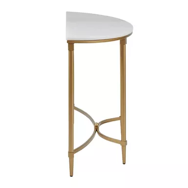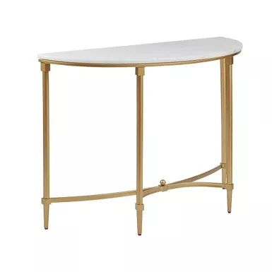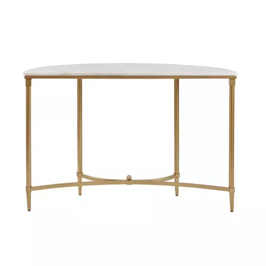 The Cosette Console Table transforms your living room with its sophisticated traditional style. Flaunting a high-class look, this console table showcases a white marble table top with beautifully coordinating gold metal legs. Slip this elegant console table into your living room or home office to bring a glamorous allure to your decor. Assembly is required.