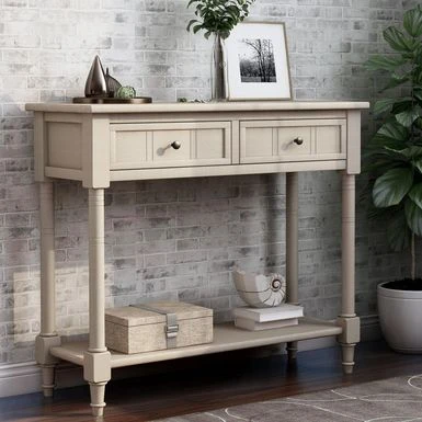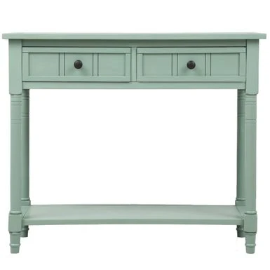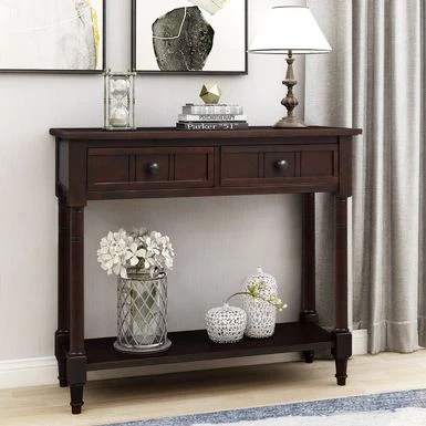 Add classic elegance to your home with the Daisy Series Console Table. The rich deep espresso finish complements the vintage antique-inspired design, featuring carved detailing for whimsical charm. Expertly smoothed and lacquered solid Pine wood construction ensures durability and longevity. Two spacious storage drawers allow for concealed organization, while the thick bottom display shelf tastefully showcases decor. With overall dimensions of 35.43″ L x 13.8″ W x 29.9″ H, this console table is perfect for entryways, living rooms, dining rooms, dens, studies and more. User-friendly assembly is simple with legs and shelf easily attached.