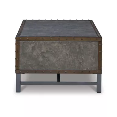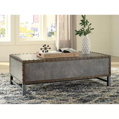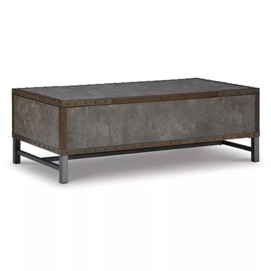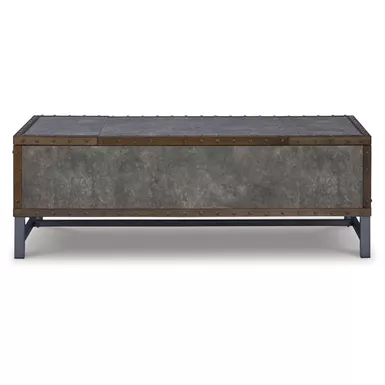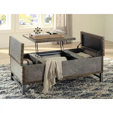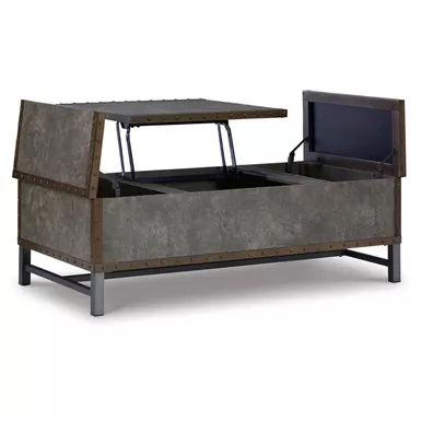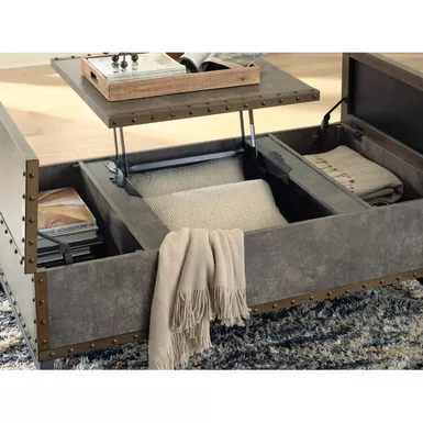 Reinvented for the here and now, this lift-top coffee table rocks vintage industrial design with a traditional vibe. Its metal accent trim and bronze-tone metal base frame are ready to embrace the modern demands of everyday life. Two spacious storage bins provide additional storage, while the center lift top transforms into a casual work center or extra dining space when needed.