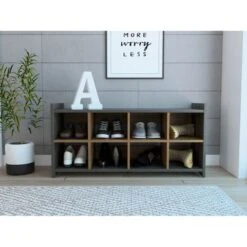 Harrison Entryway Shoe Rack has 8 cube spaces to hold 8 pairs of shoes. The shoe rack is designed to help keep your entryway or closet organized and tidy, while also providing a stylish solution for storing shoes. It can also be used to store other supplies such as baskets or bins. The shoe rack is made of particleboard and has a carbon espresso finish that is resistant to humidity. The dimensions of the shoe rack are 39.7″ W x 13.15″ D x 17.4″ H.
