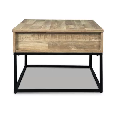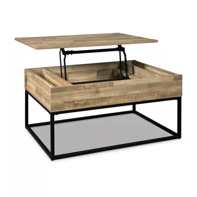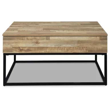 This cool cocktail table offers a fresh take on urban style with a casual lift top design and replicated butcher block finish. The metal base elevates the table and provides open space to add a lightness to your room.