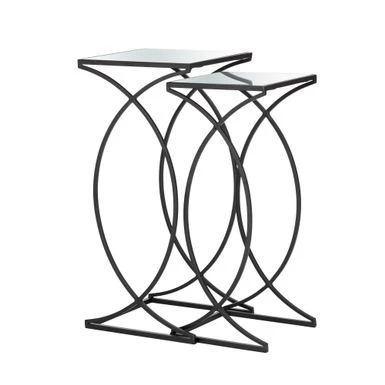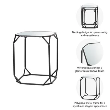 Add a touch of modern glam to your home decor with this set of two Glitzhome nesting accent tables. The hand-forged solid iron frame and tempered glass top with MDF support make these tables both sturdy and stylish. Available in multiple finish colors, you can choose between a square or octagon shape to best fit your space. The smaller table conveniently nests under the larger one, making it a space-saving design that is easy to move from room to room. With a mirrored glass top that brings a reflective touch, and oxidation that creates unique dents and markings, these tables are sure to be a conversation piece in any room.
