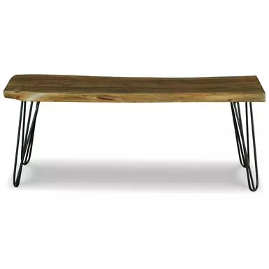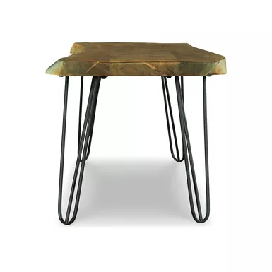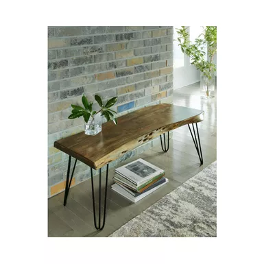 With its back-to-nature sensibility, this accent bench is a natural fit for your well-edited space. Its clean-lined design lets the beautifully organic quality and inherent luster of the solid wood shine through. From its live edge top to the rich brown finish, it’s a piece that makes a statement by being remarkably understated. The black metal hairpin legs add a striking contemporary counterpoint.