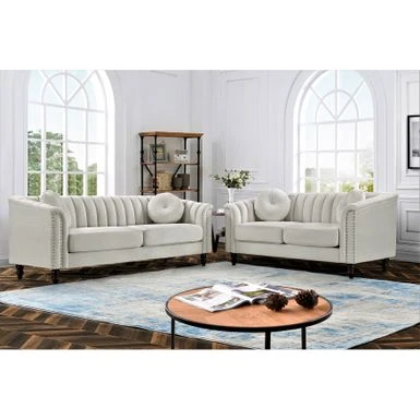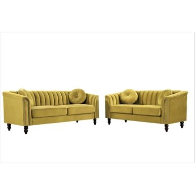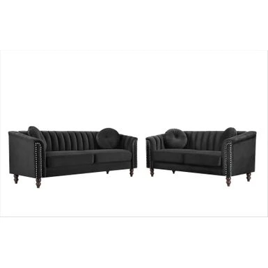 Elevate your living room with the Hills Tufted Back Nailhead 2PCS Living Room set. This consciously crafted set features classic design elements, including scrolled arms, turned legs, and nailhead accents, upgraded with a modern touch of channel tufting. The soft velvet upholstery and high-density foam provide luxurious comfort, while the streamlined statement piece adds a touch of elegance to any interior space. Complete with a sofa measuring 75.2″W x 30″D x 30.3″H and a loveseat measuring 61.4″W x 30″D x 30.3″H.