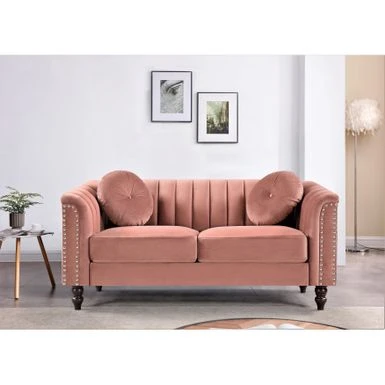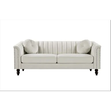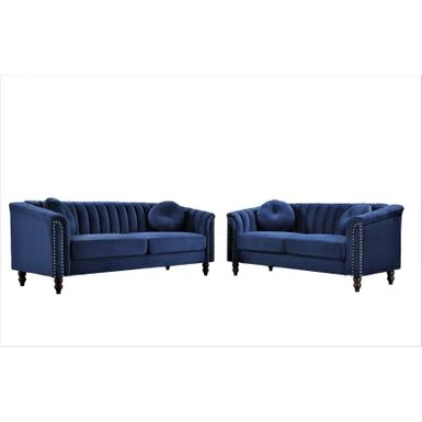 Elevate your living room with the Hills Tufted Back Nailhead 2PCS Living Room set. This consciously crafted set features classic design elements, including scrolled arms, turned legs, and nailhead accents, upgraded with a modern touch of channel tufting. The soft velvet upholstery and high-density foam provide luxurious comfort, while the streamlined statement piece adds a touch of elegance to any interior space. Complete with a sofa measuring 75.2″W x 30″D x 30.3″H and a loveseat measuring 61.4″W x 30″D x 30.3″H.
