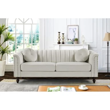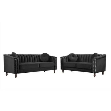 Elevate your living room with the Hills Tufted Back Nailhead 2PCS Living Room set. This consciously crafted set features classic design elements, including scrolled arms, turned legs, and nailhead accents, upgraded with a modern touch of channel tufting. The soft velvet upholstery and high-density foam provide luxurious comfort, while the streamlined statement piece adds a touch of elegance to any interior space. Complete with a sofa measuring 75.2″W x 30″D x 30.3″H and a loveseat measuring 61.4″W x 30″D x 30.3″H.