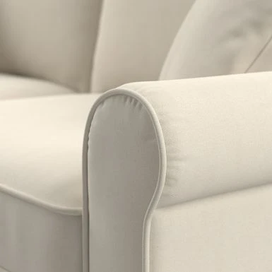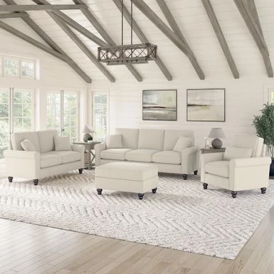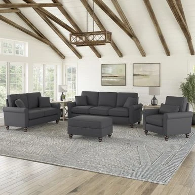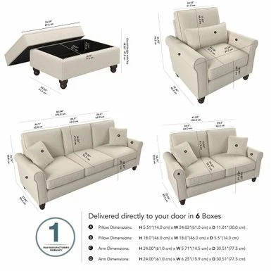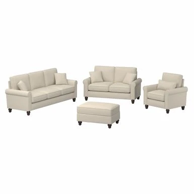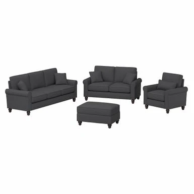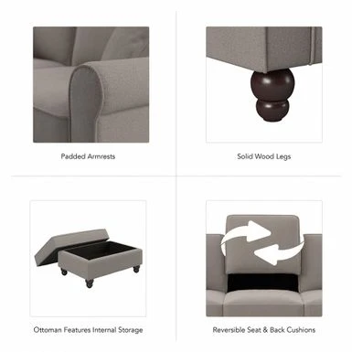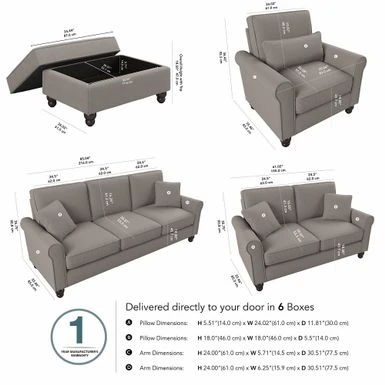The Bush Furniture Hudson 85W Sofa with Loveseat, Accent Chair, and Ottoman boasts remarkable quality and durability to match its timeless style. The Bush Furniture Hudson 85W Sofa with Loveseat, Accent Chair, and Ottoman boasts remarkable quality and durability to match its timeless style. Conveniently packaged for easy movement into and around any room or tight-fitting corridor, this ready-to-assemble living room set with matching pillows offers a practical solution for furnishing a small apartment, large home and everything in between. Enjoy the company of friends and family or take a moment to relax by yourself on high-density foam cushioning and pocket coil seat springs that maintain their shape and feel for years of comfort. Reversible seat and back cushions feature kid and pet-friendly StainGard(TM) fabric that repels dirt, oil, water and other liquids to prevent unsightly blemishes. The sturdy metal and wood framework includes a quiet sinuous spring design with cross supports that won’t sag or shift over time. Keep blankets, reading materials and more stashed in the Storage Ottoman while resting your feet on its padded surface. Espresso-stained rounded bun feet and rolled armrests reflect a sophisticated style that perfectly complements French country, farmhouse, coastal and traditional decor.Herringbone upholstery options are available in several unique colors for a look that matches any space and taste. This living room couch and chair set has been rigorously tested for safety, durability and stain resistance and is backed by the Bush Furniture 1 Year Manufacturer’s Warranty.