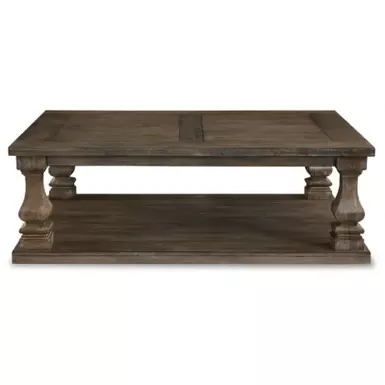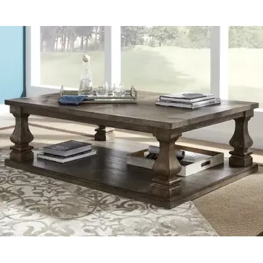 Homey. Hearty. Heavenly hued. Luring with a distressed weathered gray finish and square baluster legs set on a broad lower shelf for great presence, the Johnelle coffee table is sure to make your homestead feel that much more like home. The look is beautified with elm veneers and a framed and plank-effect tabletop for a richly crafted masterpiece made for years of satisfaction.
