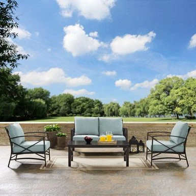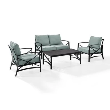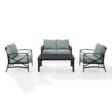 - Set includes: Loveseat, two chairs, coffee table
