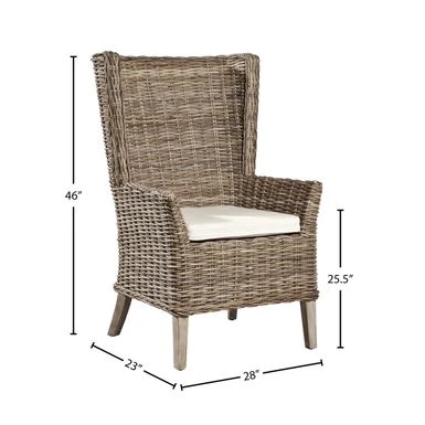 A beautifully hand-woven rattan overlay wraps this chair’s sturdy wood frame, creating a chic, richly textured silhouette. The Key West chair brings to mind the romance of “African Queen” and the lure of warmer climates. Sturdy kubu construction over a rattan frame makes this arm chair a stylish choice for the dining room or sun room. The muslin seat cushion is included for your seating comfort.