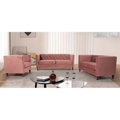 Make a statement with the Lisette Velvet 3PCs Living Room Set. The updated, clean-lined silhouette with tight square arms and wood tapered feet is upholstered in luxurious crushed velvet, bringing out this set’s glamorous side. Exquisite details including high-density foam fill with spring support, piped seat cushions, and a button-tufted backrest elevate the design, making it a perfect fit for your regal tastes.