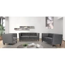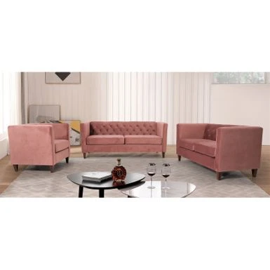 Add a touch of luxury to your living room with the Lisette Velvet 3PCs Living Room Set. This set includes a classic armchair, a cozy loveseat, and a spacious sofa. Crafted from high-quality wood, each piece boasts a clean-lined silhouette with tight square arms and wood tapered feet. The crushed velvet upholstery adds a touch of glamour, while the high-density foam fill with spring support ensures maximum comfort. The button-tufted backrest and piped seat cushions elevate the design and add timeless appeal.
