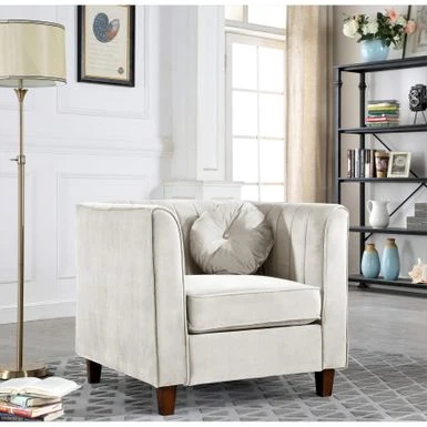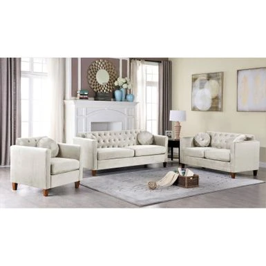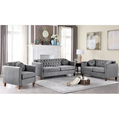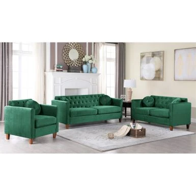 Elevate your living space with the timeless appeal of the Lory Velvet Kitts Classic Chesterfield Sofa, Loveseat, and Chair. This piece boasts a clean-lined silhouette, tight square arms, and tapered wooden feet, all crafted from a sturdy wooden frame. The crushed velvet upholstery adds a touch of glamour, while details like high-density foam and spring support, piped seat cushions, and button-tufted backrest provide comfort and style. This set comes complete with coordinating throw pillows.