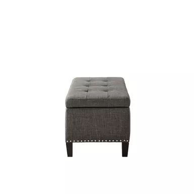 This modern storage ottoman accentuated with button tufting provides ample storage and features an elegant grey linen fabric with black noir legs. Assembly required.
