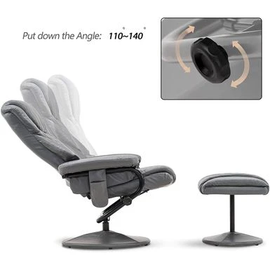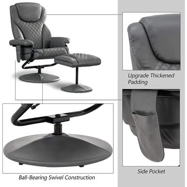 - Swiveling Recliner and Matching Ottoman Uniquely designed recliner features a ball-bearing swivel base that makes swivel effortless. Knob adjusting recliner with infinite adjustments. 360 degree swivel chair base and recline features allows for fun and easy movement in a place. The ottoman is for you to relax your leg while reclining on this leisure chair.