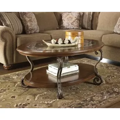 - Beveled glass top with scrollwork underlay