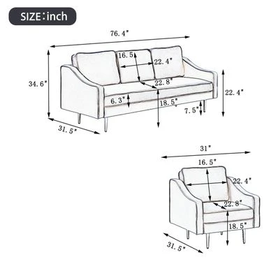 - 3-Seat Sofa: 76.4″L x 31.5″D x 34.6″H