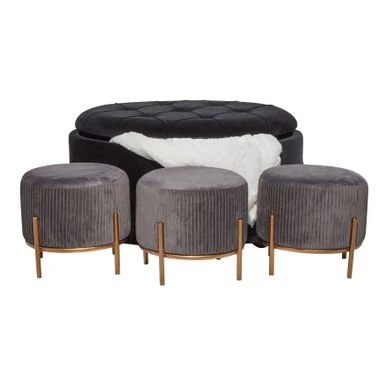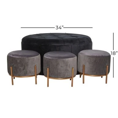 Storage seats elevate the styles of minimalist, contemporary, and modern interiors. Organizing isn’t boring when you have an amazing storage unit at your disposal. Filled with shoes, books, blankets and more, these storage units are a stylish and convenient way to store your stuff. This item comes shipped in one carton. Large seat opens at the top to reveal a storage. Suitable for indoor use only. This is a 4-piece ottoman set. Glam inspired. Maximum weight limit is 200 lbs