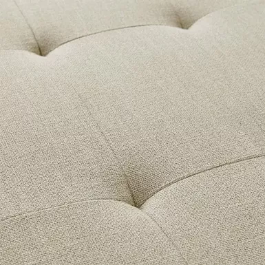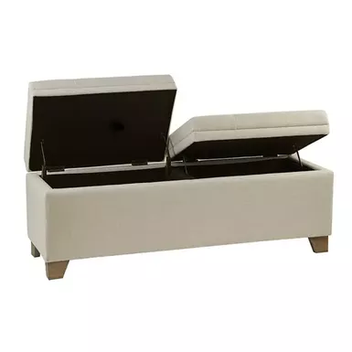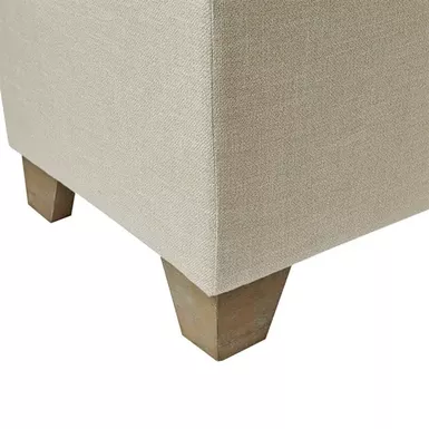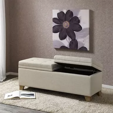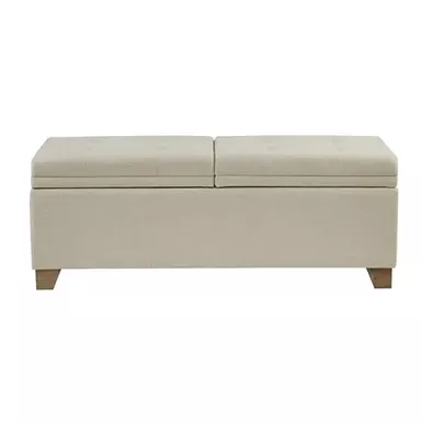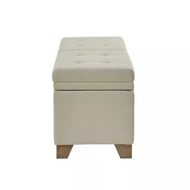 Bring style and functionality to your home with the Madison Park Ashcroft Storage Bench. Upholstered in a natural-hued fabric, this storage bench features a button-tufted top split in half and an ample space for your blankets. The solid wood legs complement the upholstery with a natural finish. Simple and versatile, this upholstered storage bench pairs easily with most home decors. Assembly required.