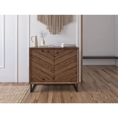 Add a touch of elegance to any room with the Nikolas Accent Cabinet Oak. This 2-door cabinet provides ample storage space for glassware, books, games, and more. Featuring push-to-open hardware and adjustable European door hinges, this cabinet boasts a metal base and 3D textured wood laminate for a unique look. The adjustable interior shelf with metal shelf pins and floor glides make it both functional and stylish.