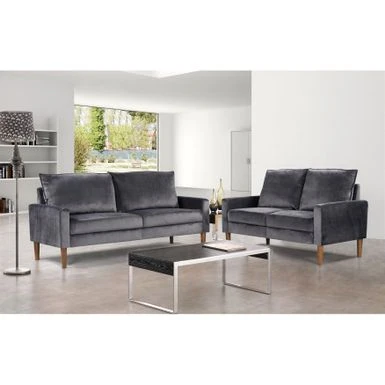 Add a touch of modern minimalism to your living space with the Petit Secret living room set. This sofa and loveseat are consciously crafted with luxurious velvet fabric, solid hue, track arms, and a clean-lined silhouette. The warm brown stain four legs provide stability to the solid and manufactured wood frame, foam fill, and coil spring supports that offer utmost comfort. Whether you’re relaxing or entertaining, this living room set will be a timeless addition to your home decor. Assembly is required.