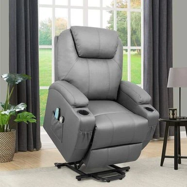 Experience ultimate relaxation with the Power Lift Recliner PU Leather with Massage and Heating. This motorized recliner smoothly lifts you up with the push of a button, providing effortless standing without straining your back or knees. The electric control allows you to recline to different angles, including a cozy lying position, while the footrest extends for full-body stretching. Enjoy a luxurious full-body massage with the four-point massage (back, lumbar, thigh, leg) and five adjustable modes, complete with heating function on the lumbar area for waist pressure relief and improved blood circulation. The classic design features smooth PU leather, wide seating space, thick sponge padding, and a raised headrest for optimal neck support. Convenient storage pockets and cup holders keep your essentials within easy reach, and the chair is easy to clean with a simple wipe.