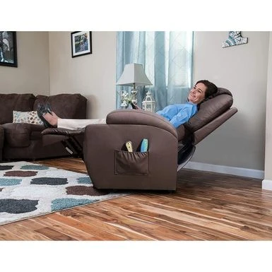 Experience ultimate relaxation with the Power Lift Recliner PU Leather with Massage and Heating. This motorized recliner smoothly lifts you up with the push of a button, providing effortless standing without straining your back or knees. The electric control allows you to recline to different angles, including a cozy lying position, while the footrest extends for full-body stretching. Enjoy a luxurious full-body massage with the four-point massage (back, lumbar, thigh, leg) and five adjustable modes, complete with heating function on the lumbar area for waist pressure relief and improved blood circulation. The classic design features smooth PU leather, wide seating space, thick sponge padding, and a raised headrest for optimal neck support. Convenient storage pockets and cup holders keep your essentials within easy reach, and the chair is easy to clean with a simple wipe.