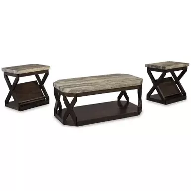 A cool cross of textural elements make the Radilyn coffee table set with crisscross details a striking choice. Bathed in a polyurethane finish for practicality’s sake, the faux marble tops are thick and substantial. Magazine shelves seamlessly blend into the end table design, while optional casters on the coffee table add flexibility.