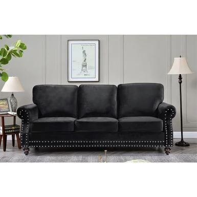 Upgrade your living space with the Ramos Nailhead Velvet 2-Piece Set, including a loveseat and sofa. Crafted with high-quality materials, this set features soft velvet upholstery for a timeless look and luxurious comfort thanks to the high-density foam. The loose back cushions can be arranged to highlight the beautiful details, while the solid wood turned legs add a traditional touch. The nailhead trim along the bottom and arms of each piece adds a touch of flair that will elevate your decor.