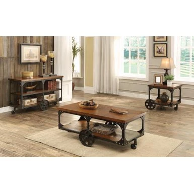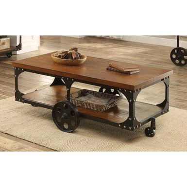 Enhance a traditional living room with down-home, country appeal. This coffee table is crafted with two large panels of rustic brown wood, infusing it with old-fashioned charm. Its classic silhouette is appealingly offset by the dark metal finish of its frame. A sturdy table top and large lower shelf offer ample storage space for your convenience. Complete with four fully functioning metal wheels, this table is attractive and versatile.