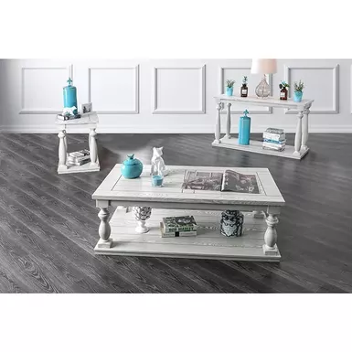 This gorgeous occasional table combines the rustic charms of wood paneling with the class of column turned legs. The beautiful turned legs give this table a silhouette reminiscent of classical architecture while the wood grain and antique white finish are filled with grounded rustic character. A flat and sturdy base doubles as a display shelf where you can let your inner interior decorator showcase their skill.