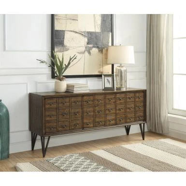 Bring a vintage touch to your entertainment space with our Somette Oxford Distressed Brown Three Door Media Console. This console features a spacious interior with two adjustable shelves and cord management to keep your wires and components organized. The rich Oxford Distressed Brown finish and vintage card catalog design make it a standout piece for any den, family room or entry.
