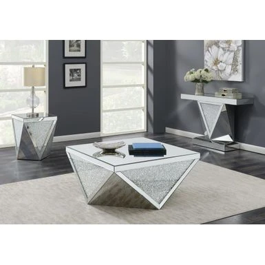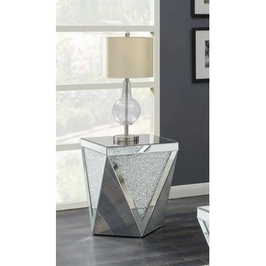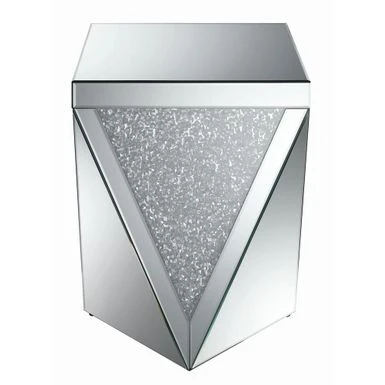 Dress up your decor with breathtaking, modern luxury. This contemporary end table adds a touch of sparkle to any living space. Its bold, diamond-shaped design exudes opulent style. Its smooth, silvery finish is accentuated by triangular panels of eye-catching, glittery material. Exquisitely designed, this table makes a bold statement in any modern home.